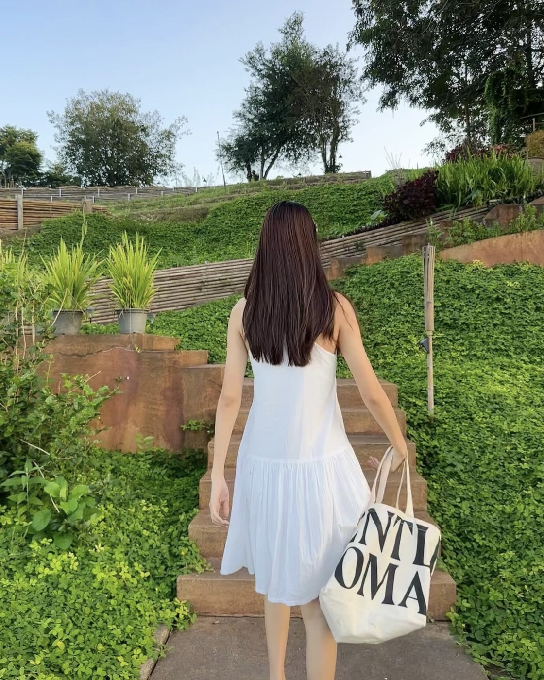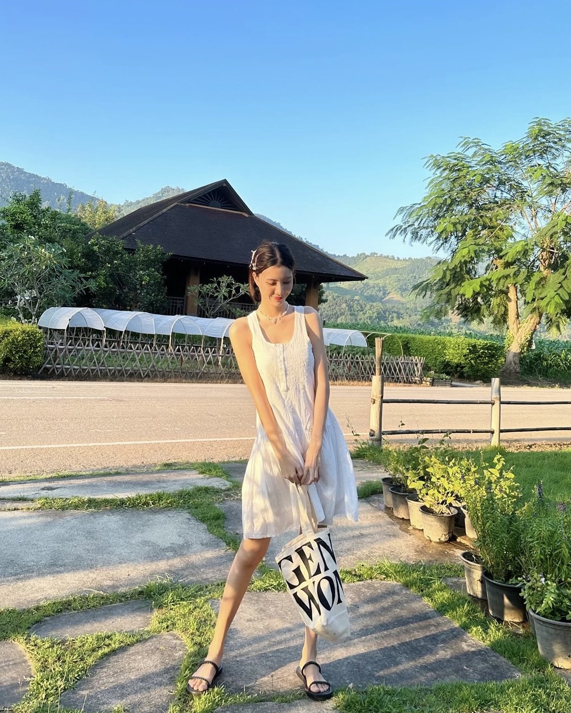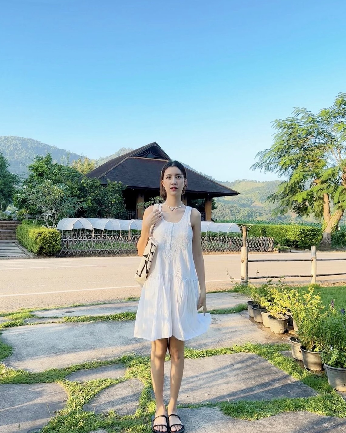 在夏日里一件白色背心裙加上一双黑色平底凉鞋,是夏日里简单大方、优雅又实用的搭配选择。