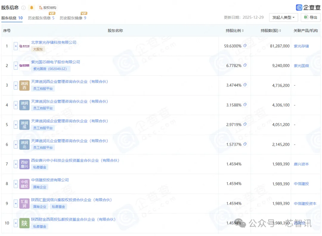 值得一提的是,紫光国芯在被紫光存储收购后,于2024年6月25日在新三板挂牌上市。2025年4月16日和2025年12月2日,紫光国芯通过定向增发分别融资2.56亿元和3亿元,定向增发的对象包括西高投、陕西科控集团、深高新投、深创投等国有资本,以及中信建投投资、北汽产投、中国西电等金融及产业资本。
