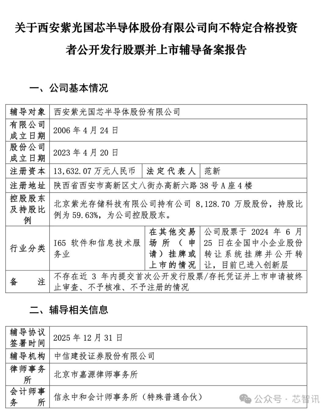 辅导备案信息显示,紫光国芯成立于2006年4月,注册资本1.36亿元,法人代表范新。公司股票于2024年6月25日在全国中小企业股份转让系统挂牌并公开转让,目前已进入创新层。