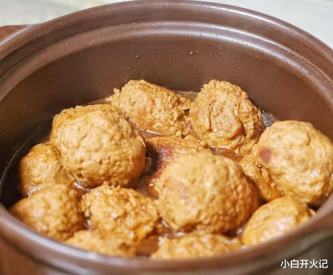 重头戏是红烧。砂锅里铺上一层白菜叶防粘,把煎好的丸子请进去,加入没过丸子三分之二的清水。调味很简单:两勺生抽、一勺老抽、一块冰糖、几片姜、几根葱,再来点料酒去腥。大火烧开后转小火,盖上锅盖,让它们在锅里"泡温泉"。