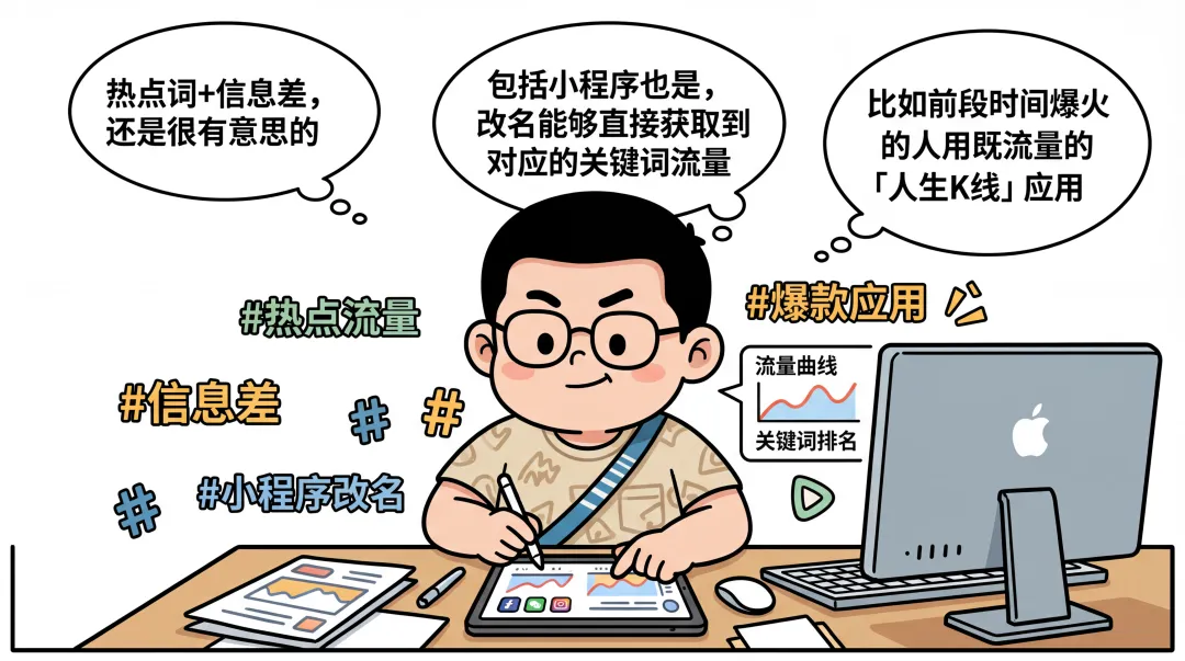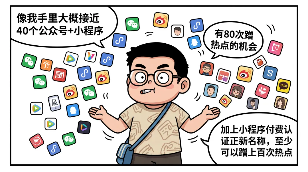 自从公众号和小程序尝试几次之后,发现这玩意,是有点东西的。像我手里大概接近40个公众号+小程序,有80次蹭热点的机会。加上小程序付费认证新名称,至少可以蹭上百次热点。每年至少会有几波全民级的热点事件,能从合适的角度蹭上几个的话,说不定也能躺平好几天。尤其是在AI的帮助下,无论是公众号蹭热点之后输出内容,还是Vibecoding生产小程序,基本上都能无压力搞定。并且在蹭热点的过程中,能很好的训练捕捉网络热点的能力。从我去年一整年的观察看下来,这个能力实际上非常重要,我的理解是其重要程度不亚于技术实现能力。尤其是在信息过载的互联网,以及AI大模型不断更迭的背景之下。