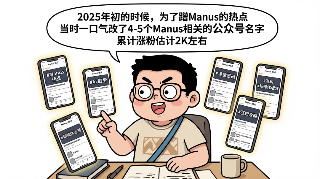 这个其实还是有点儿用的,某种程度上。2025年初的时候,为了蹭Manus的热点,当时一口气改了4-5个Manus相关的公众号名字,累计涨粉估计2K左右。