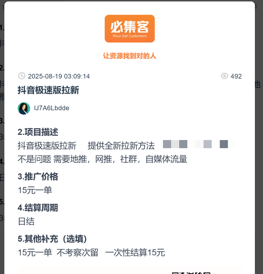 不知道大家是否了解过必集客,它是中文互联网规模最大的app拉新推广一手接单平台,而抖音极速版也是app拉新行业里长期存在的项目之一。根据必集客上的资源信息显示,当下一个有效拉新用户的佣金,大概在30~40元左右。