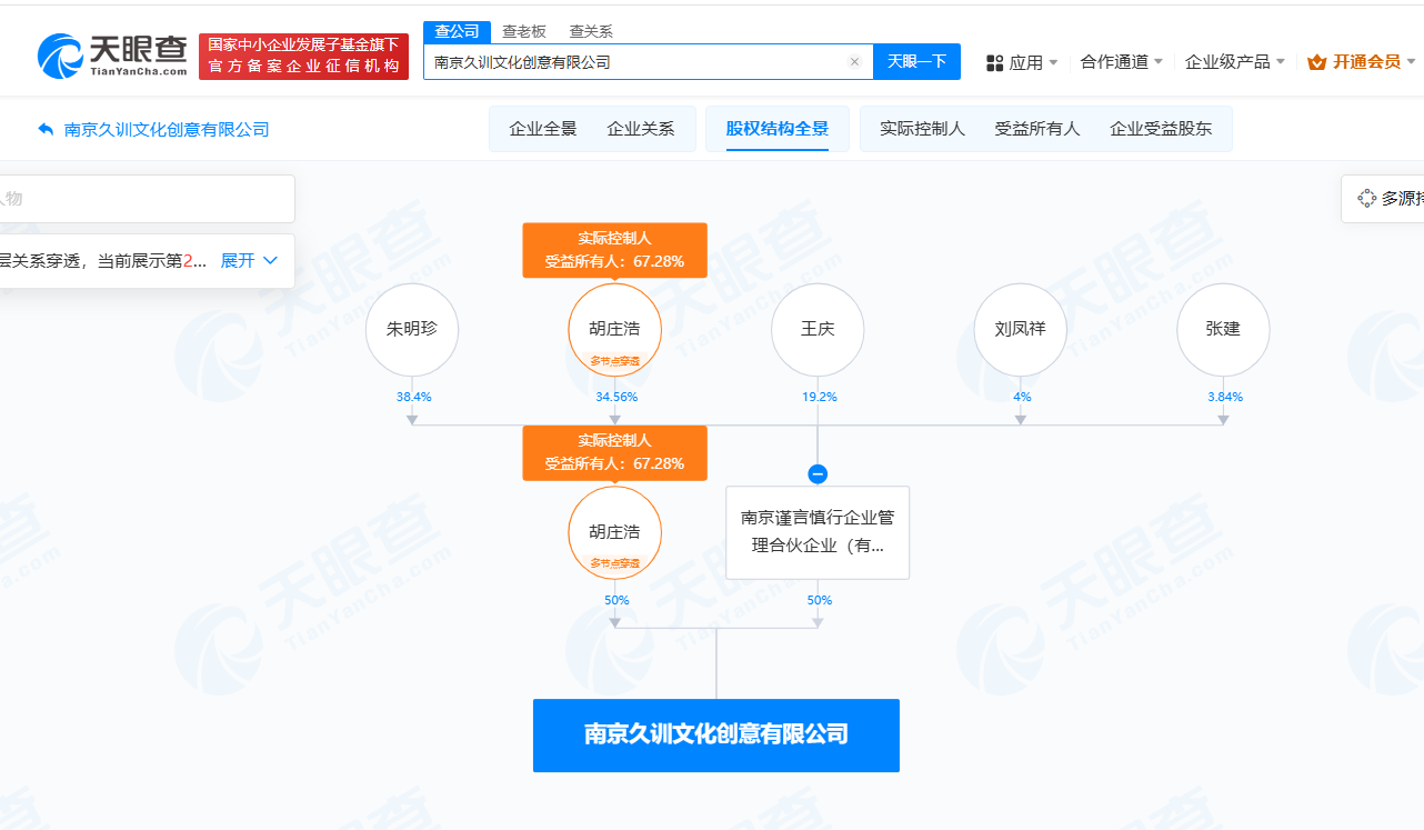 该公司成立于今年2月,注册资本100万人民币,法定代表人、执行董事为胡庄浩(游戏ID:久哲),监事为王庆(游戏ID:尘夏),经营范围包括演出经纪、组织文化艺术交流活动、文化娱乐经纪人服务等。股权全景穿透图显示,该公司由胡庄浩、南京谨言慎行企业管理合伙企业(有限合伙)分别持股50%,后者由胡庄浩、王庆、朱明珍等共同持股。