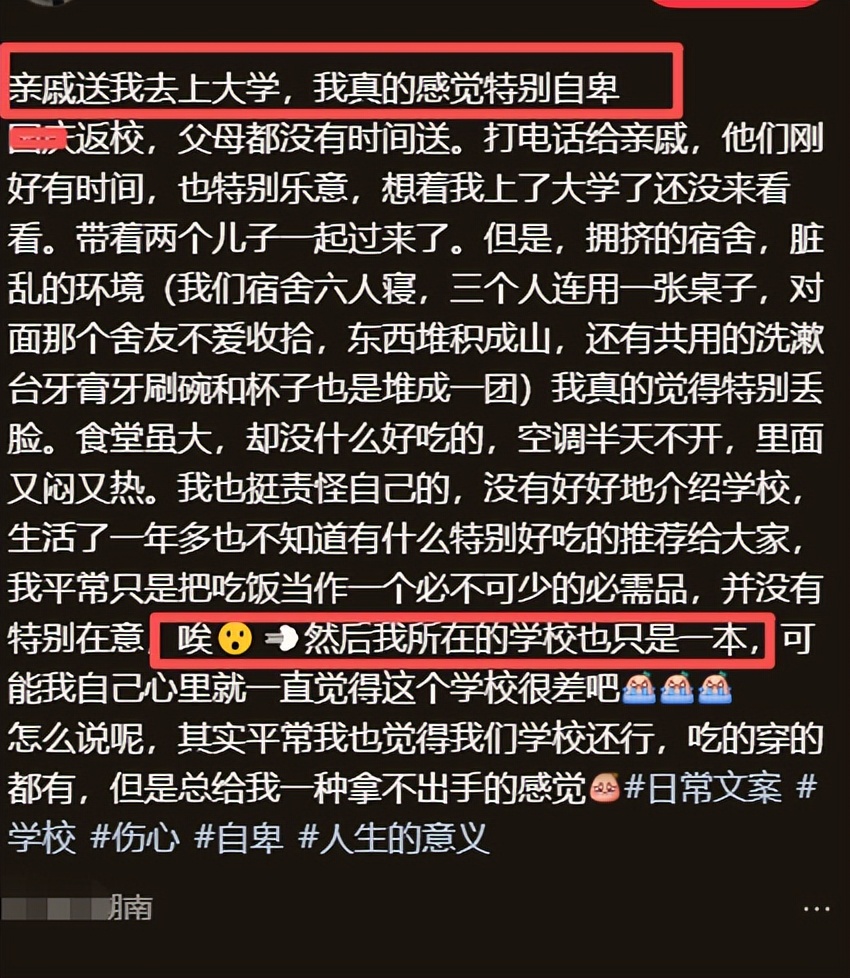 他们来到这个学校,并不会因为宿舍环境差,就觉得这个孩子不优秀,只会觉得一本大学生还是被亏待了。