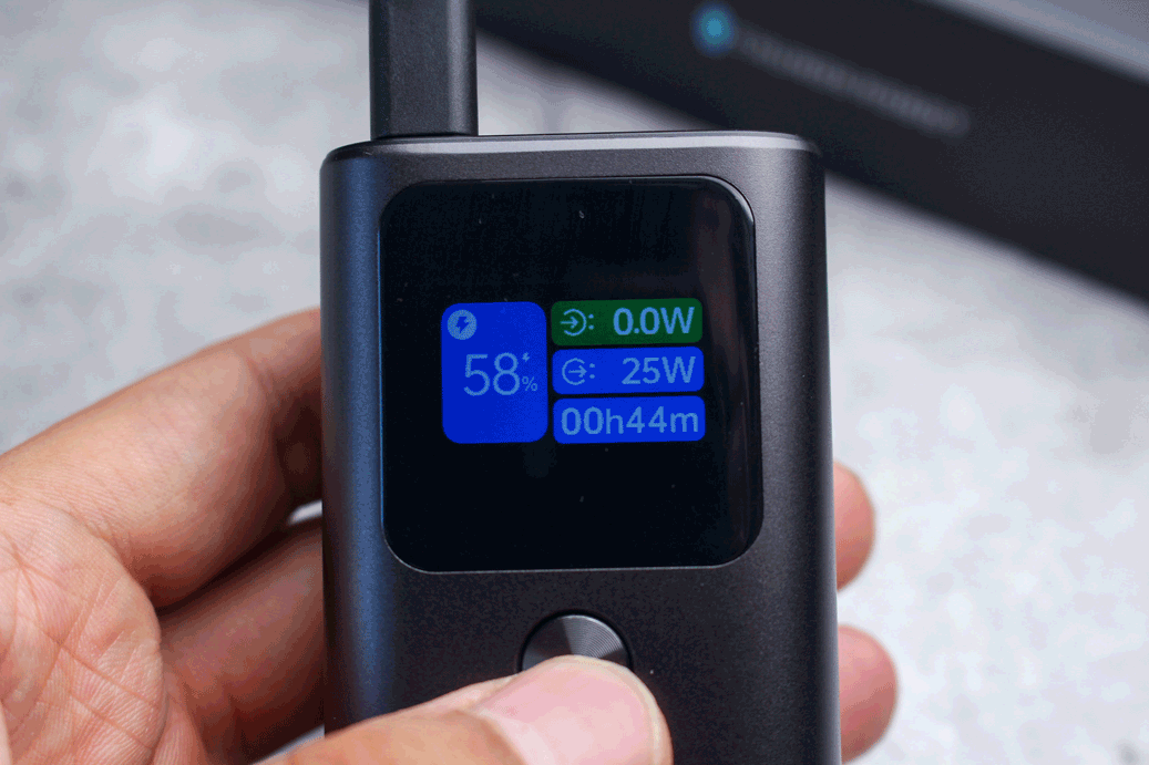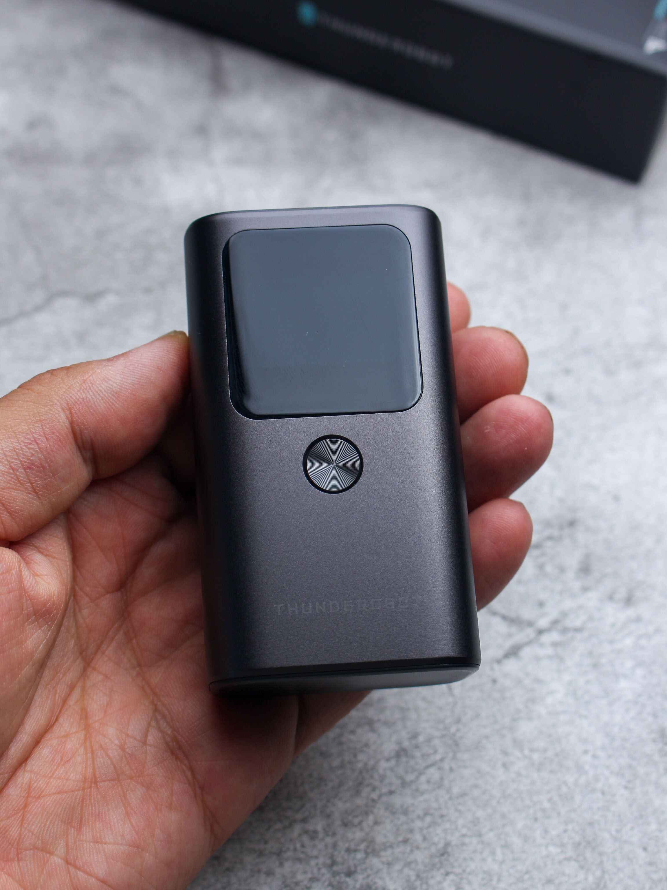 雷神V10不仅质感出众,整体尺寸设计也非常小巧,长度87.46mm、宽度50mm,正面看起来还没有一张信用卡大。正面黑色区域还配备了一块TFT彩屏,屏幕上可以显示剩余电量,输出、输入功率等信息。
