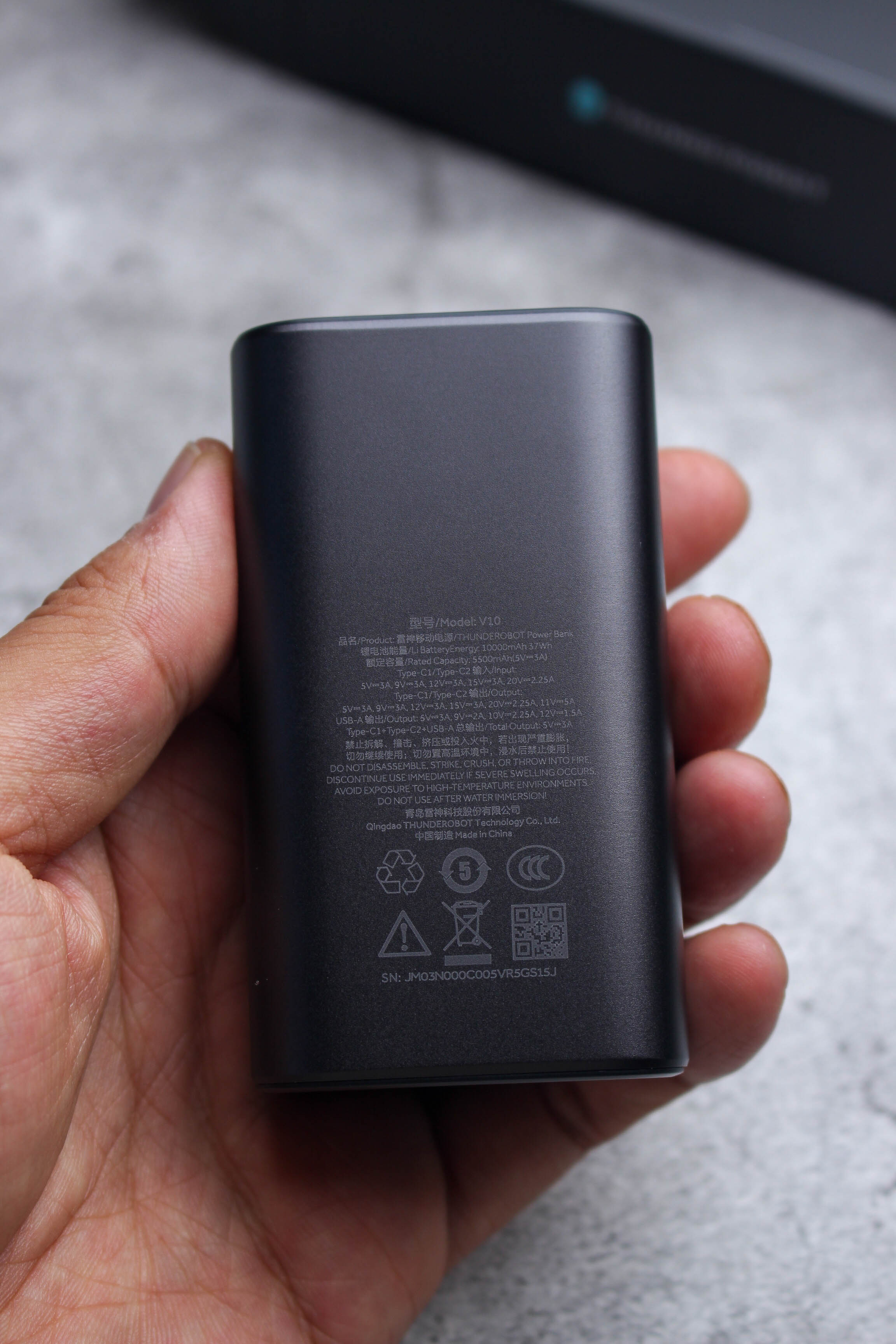 背面标识有雷神V10的一些详细信息,输入最高功率可以达到45W,输出最高功率能够达到55W。在底部能够明显看到3C标识,这也正是民航新规对于带上飞机的移动电源的要求。