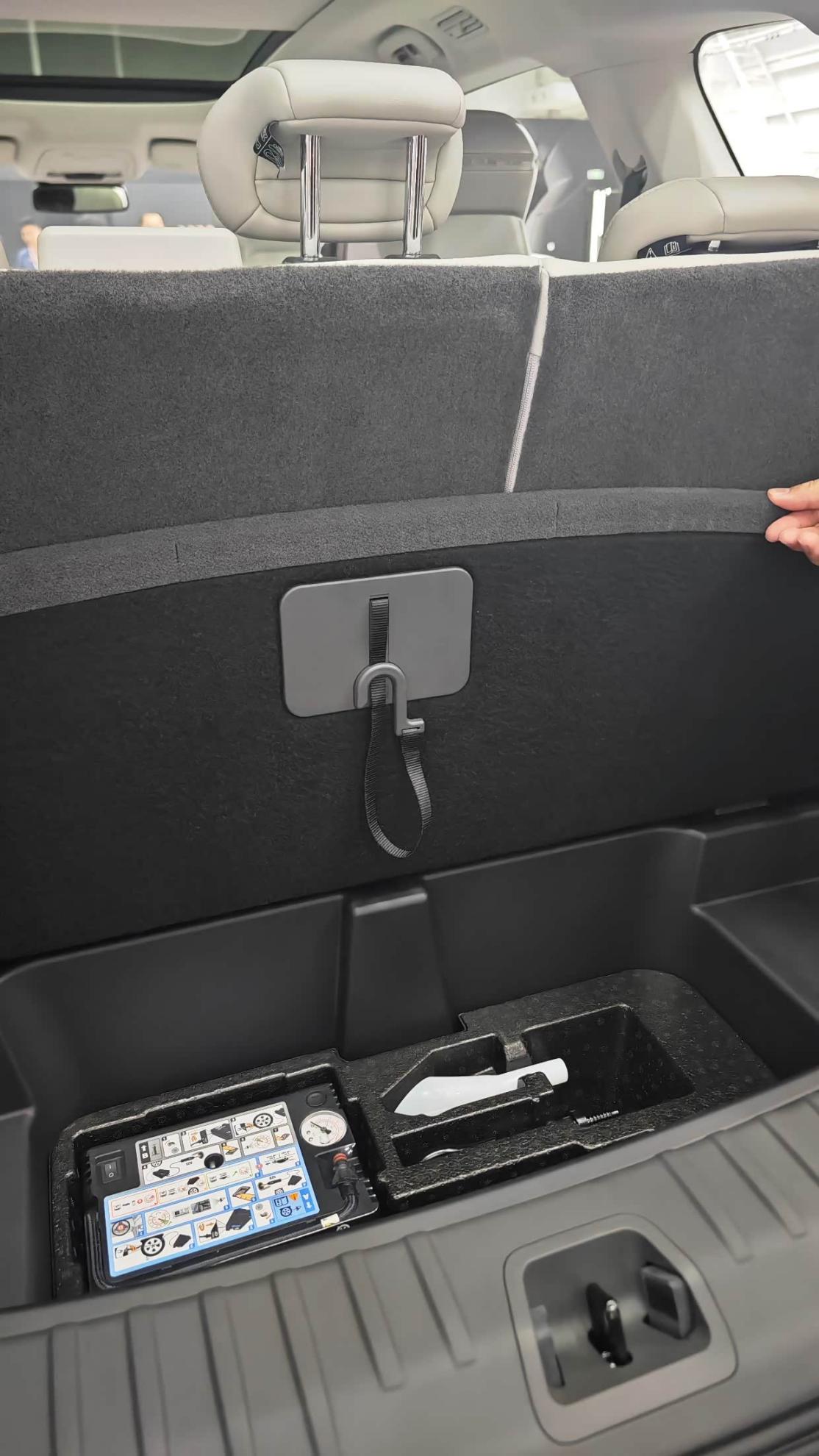 最后分享一个实用功能,就是后备箱盖板翻起来后背面有这么一个挂钩,平时可以卡在盖板背面,翻开盖板时可以把这个挂钩拿起来挂到上面头枕腿上,这样盖板就能固定住不会掉下来了!还是很贴心的一个小设计哦!