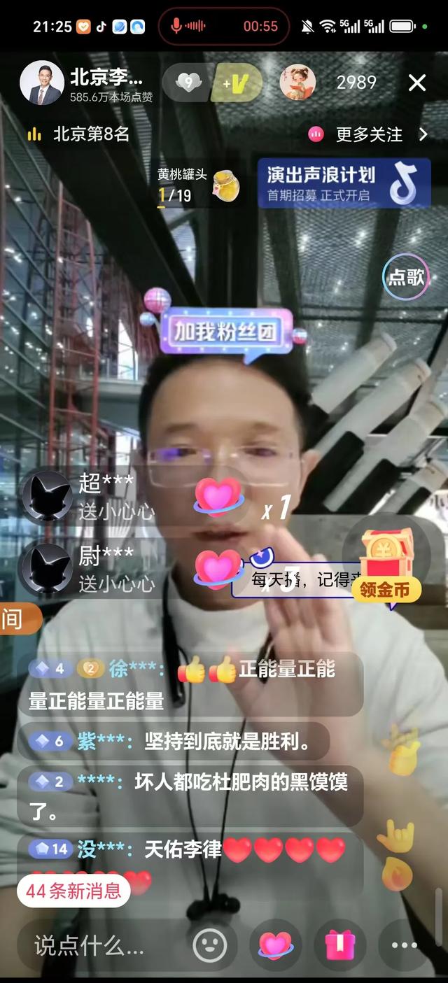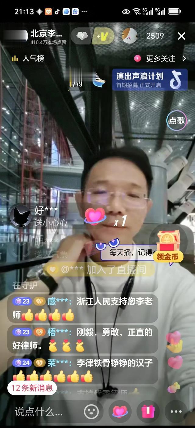 今晚李圣律师在北京首都机场进行了直播,屏幕上不停打出“刚毅、勇敢、正直的好律师!”“李律铁骨铮铮的汉子!”