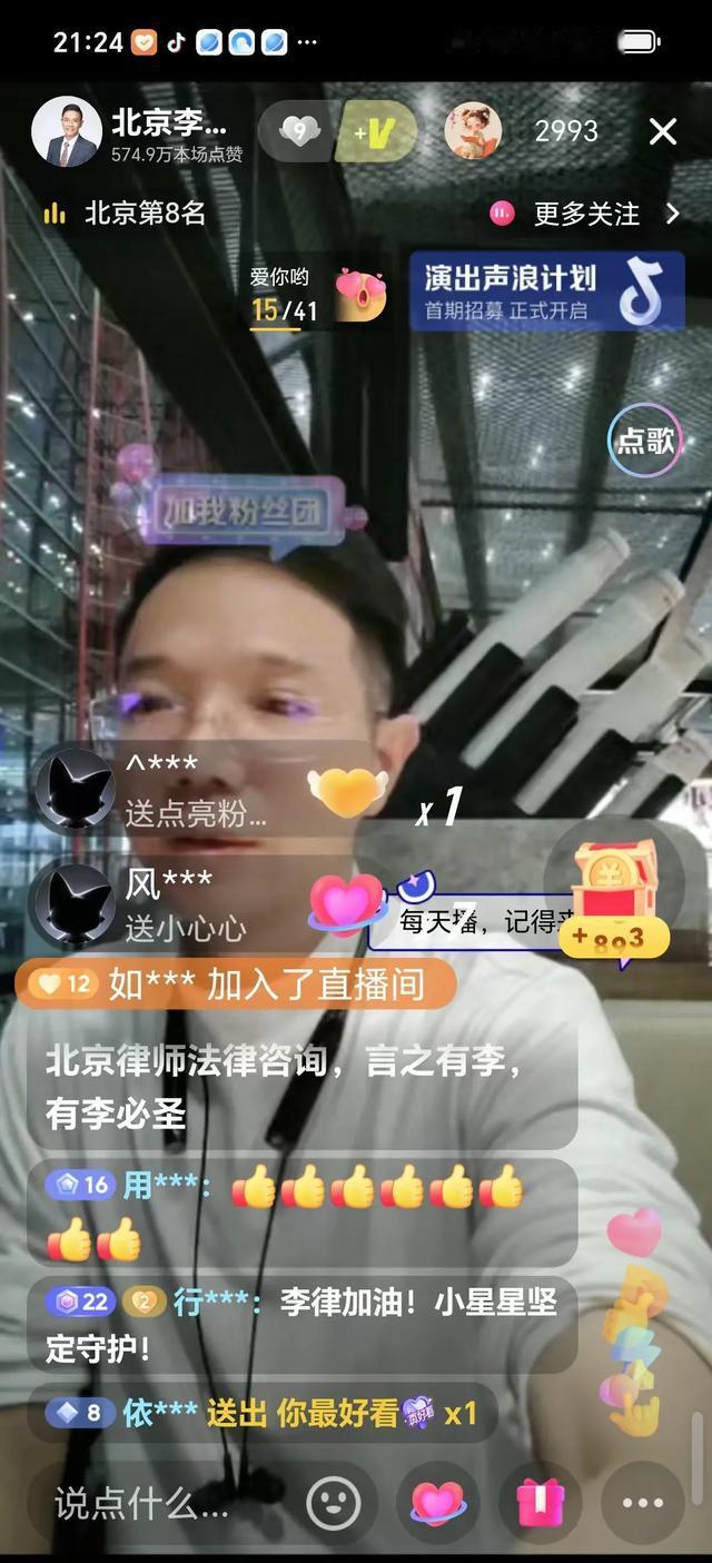 屏幕上打出“李律加油!小星星坚定守护!”“致敬正义人士!”“坚持到底就是胜利!”“天佑李律”……
