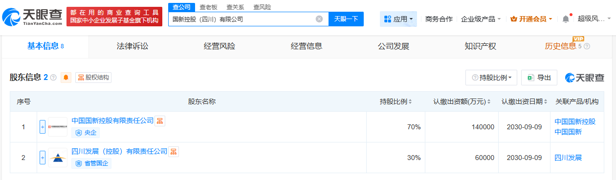 天眼查工商信息显示,近日,国新控股(四川)有限公司成立,法定代表人为辛厚东,注册资本20亿人民币,经营范围包括自有资金投