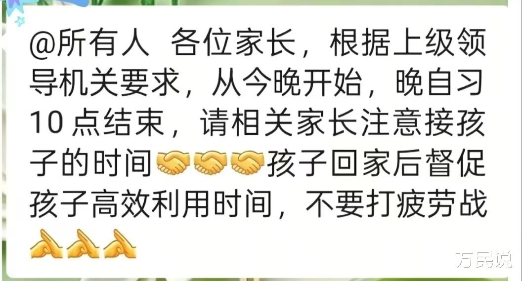 更让人惊喜的是,国庆中秋长假后的第一天,不少家长的手机都被同一则通知点亮:“所有高中从今日起晚自习22点结束”。短短一行字,在家长群里炸开了锅。