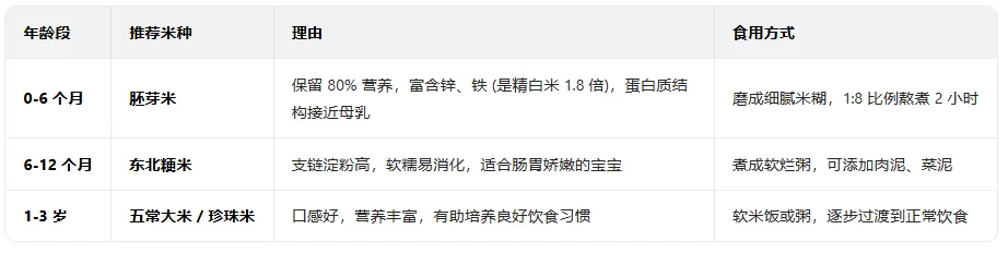 - 婴幼儿首选:胚芽米或东北粳米,营养丰富易消化,呵护娇嫩肠胃