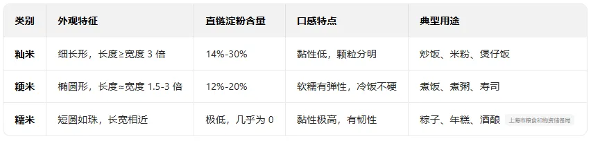 - 大米三大类:籼米(长粒)、粳米(短圆)、糯米(极黏),按稻谷类型区分