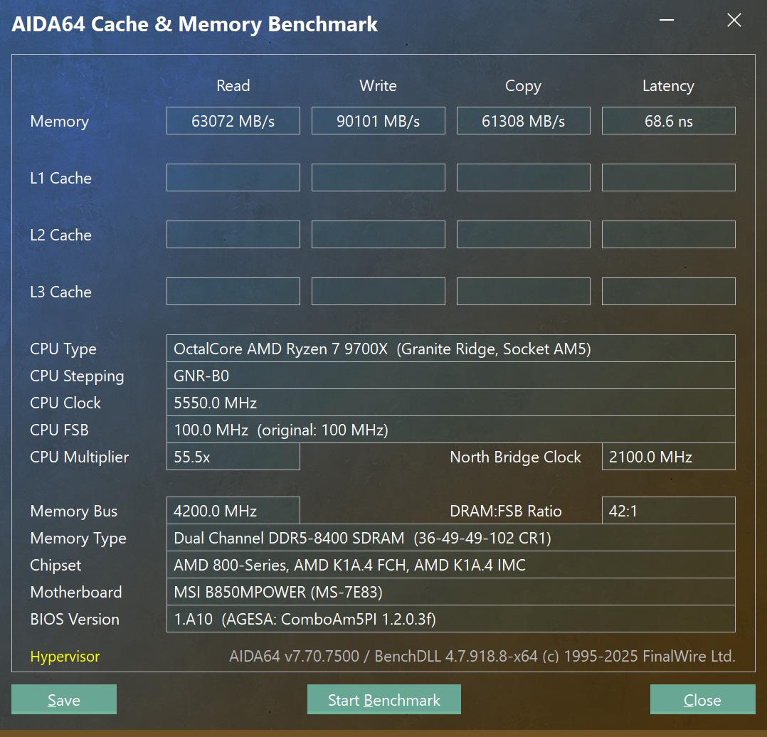 ▲ DDR5 8400 MT/s 这是我这颗渣渣体质的 9700X 之前一直无法触碰到的频率,如果你想跟我一样挑战这个频率,那么目前其实就推荐两个主板,华硕 B850m ayw OC 跟我现在用的 msi B850M Power。这两款主板都有内存电气性能特别优化,如果搭配上 9950X / 9950X3D 这一类旗舰级 CPU,搭配上此款内存,可以实现更高的内存频率。
