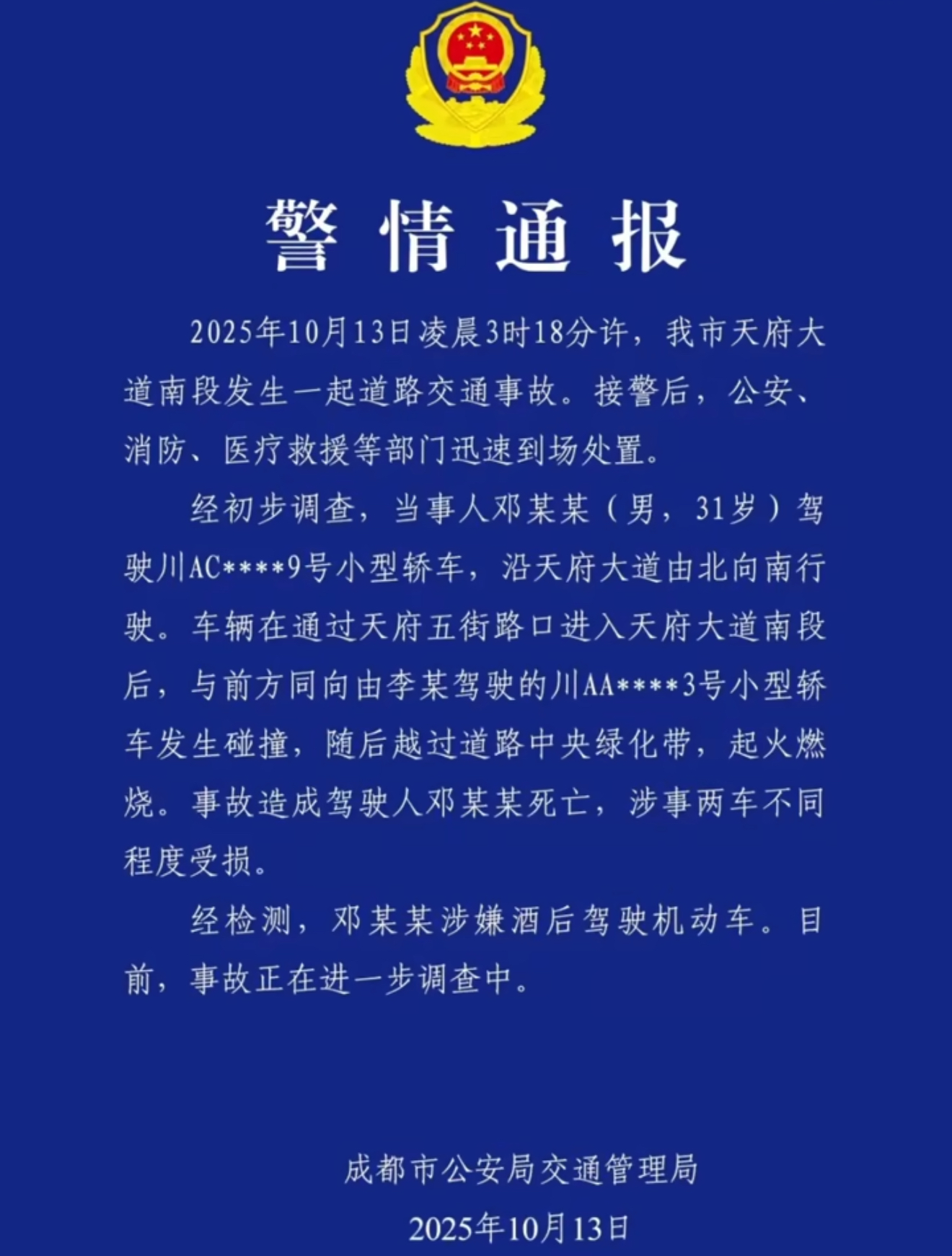 凌晨三点十八分,城市还在沉睡,霓虹灯在寂静中闪烁,可天府大道南段却突然被一声巨响撕裂了夜的宁静。一场惨烈的车祸,就这样猝不及防地闯入了我们的视野,刺痛了每一个人的心。