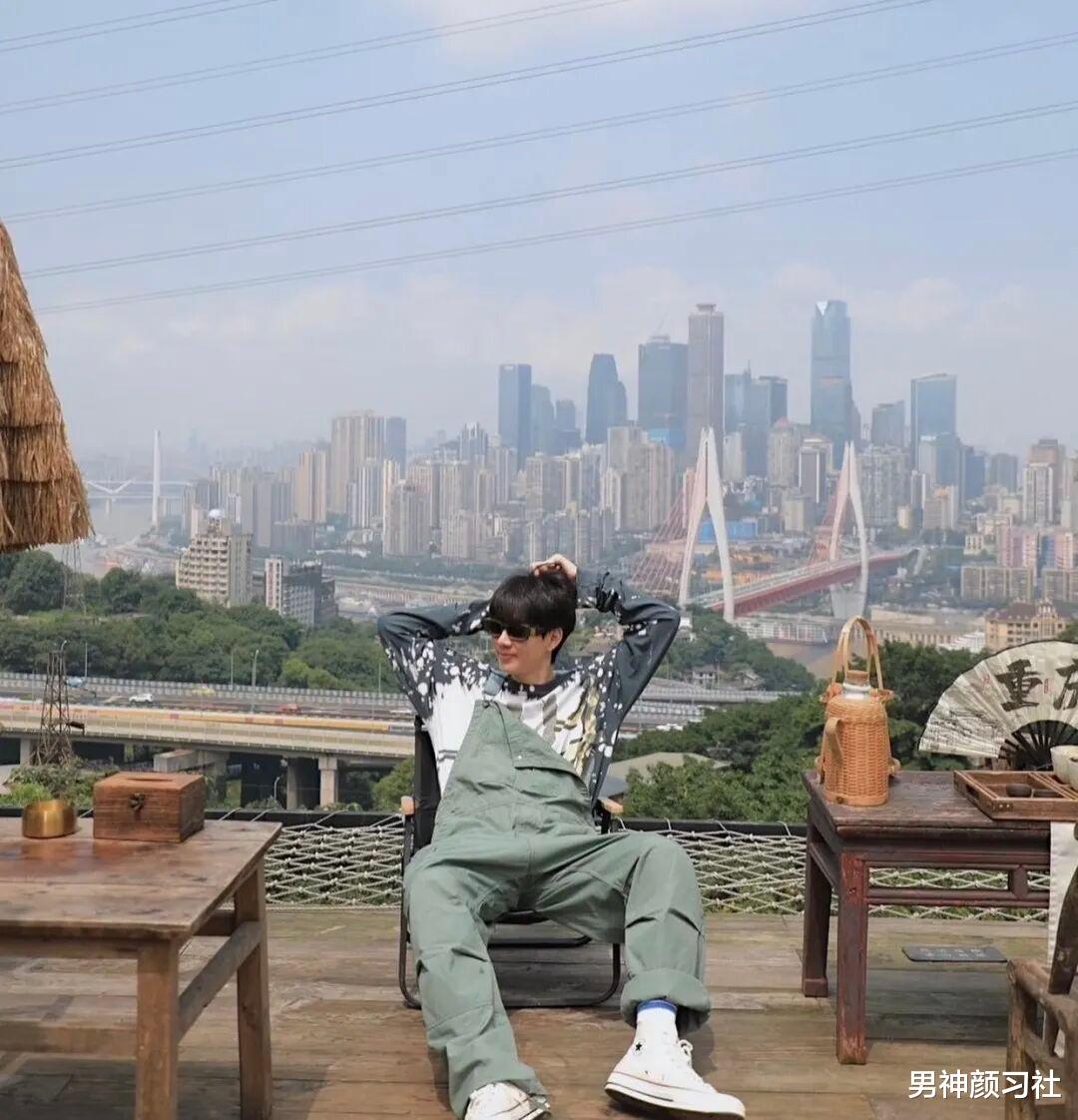 如果想要更有时髦感一点,其实也完全是可以的。像他就用了设计感上衣和背带裤的组合,来让自己的look变得更为特别。他最厉害的地方在于,把背带裤的袋子放掉一边,很吸睛。