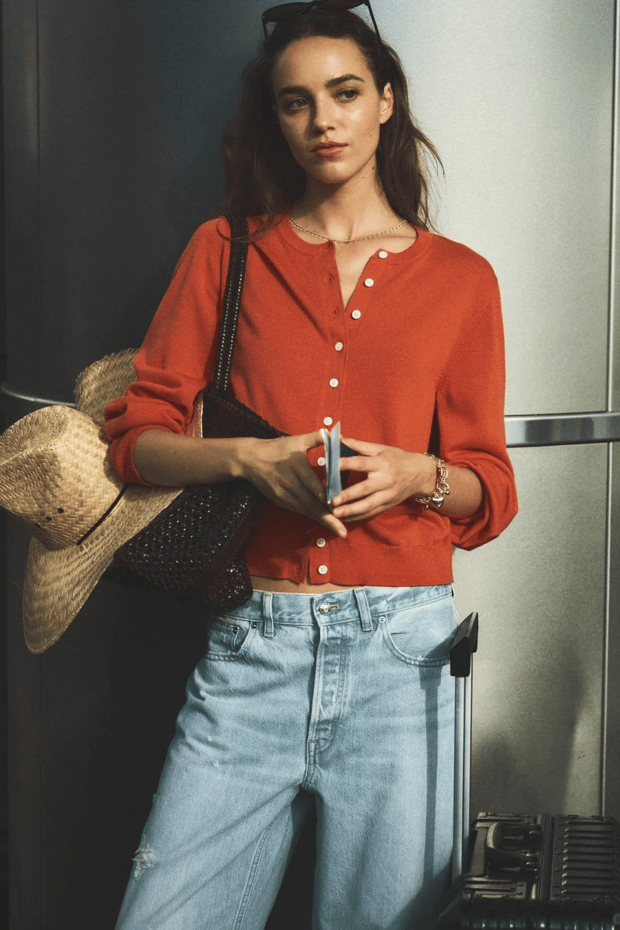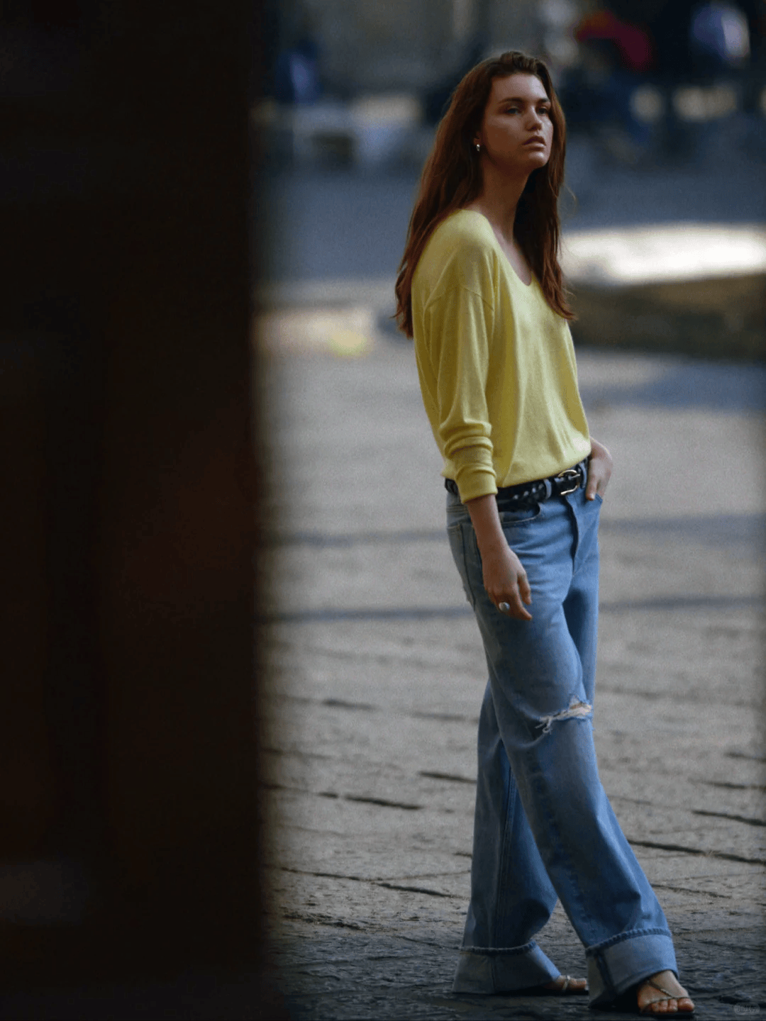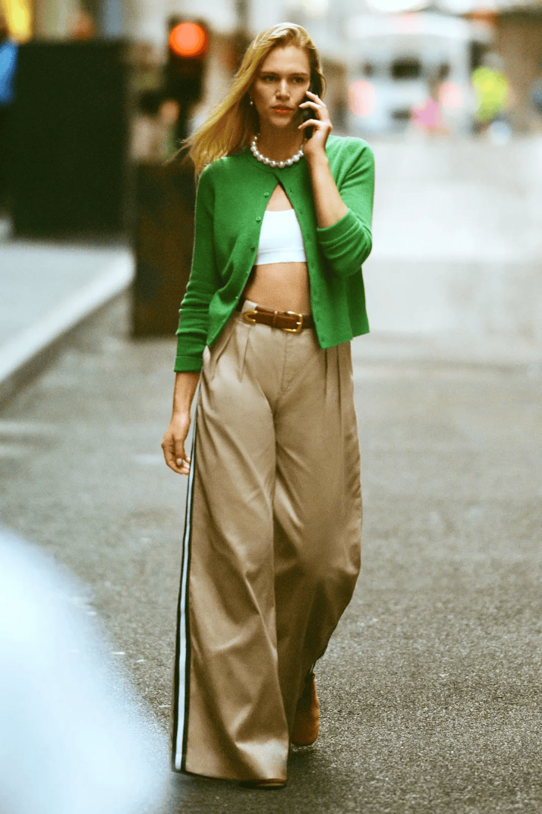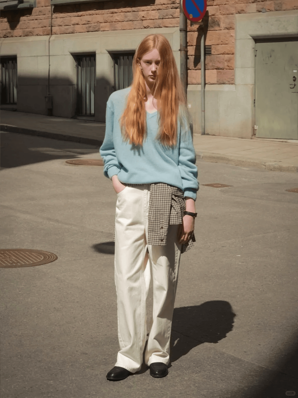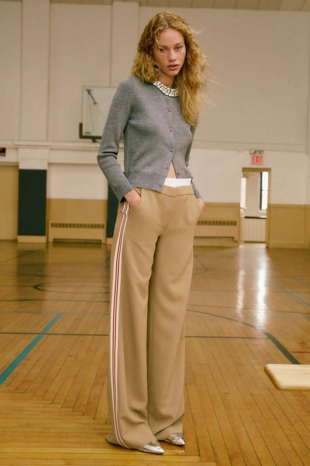 与阔腿裤搭配,颇显休闲随性的味道。