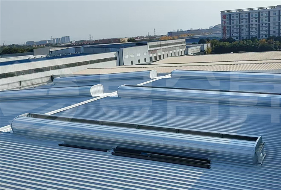 一、顺坡型屋顶采光通风器顺坡通风器骨架为热镀锌板模具成型,外板材质同厂房屋面外板一致,为不小于 0.5mm(基板), 镀铝锌含量不小于 150 g/m2,高耐候聚酯涂层(HDP)。顺坡通风器屋面为单层采光板厚度为 1.5mm 。顺坡通风器供货范围包括:骨架,外板,采光板、排水系统、泛水收边等。不含基座和基座泛水部分,通常由围护单位进行制作安装。