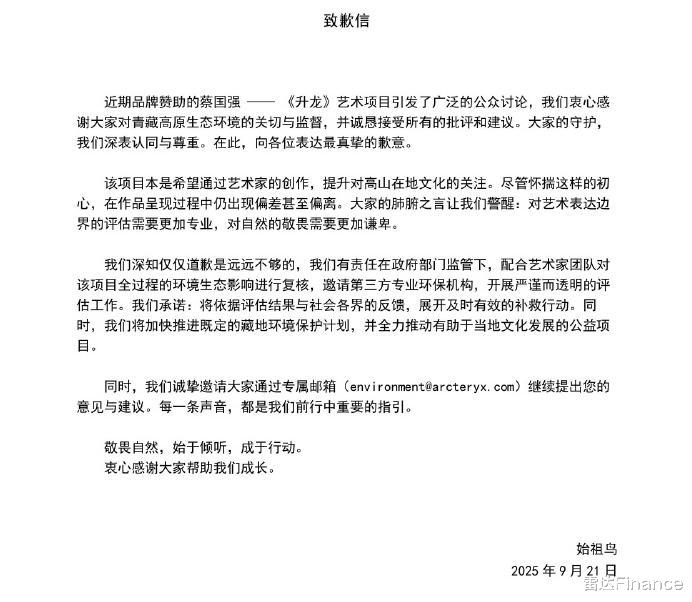 随后,始祖鸟官方和蔡国强本人也纷纷发文致歉,均表示接受批评,配合相关评估工作,并愿意采取相应补救行动。