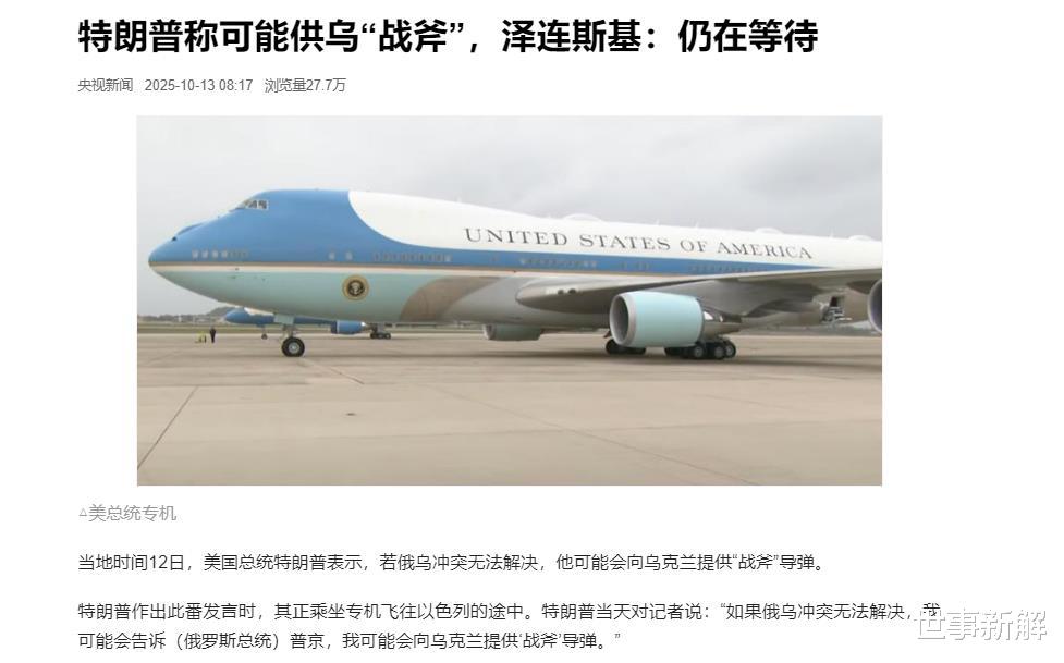 这下乌方也是喜从天降,简直就是天上掉馅饼了,于是趁热打铁,提出美方提供战斧巡航导弹,老特公开表示;他准备批准这一方案。