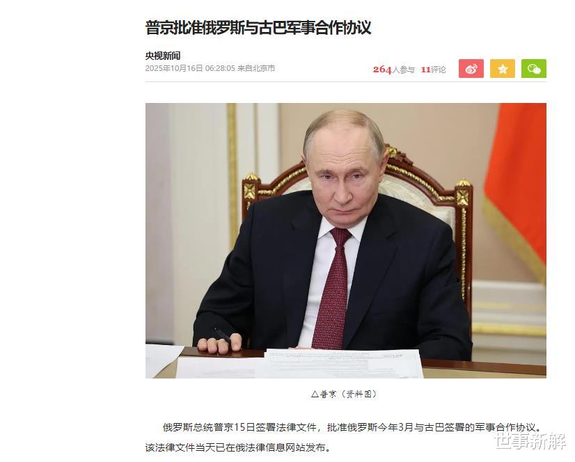 大帝既不争辩,也不反驳。直接在10月15日签署法律文件,批准俄罗斯今年3月与古巴签署的军事合作协议,开始正式生效了。该法律文件当天已在俄法律信息网站发布。