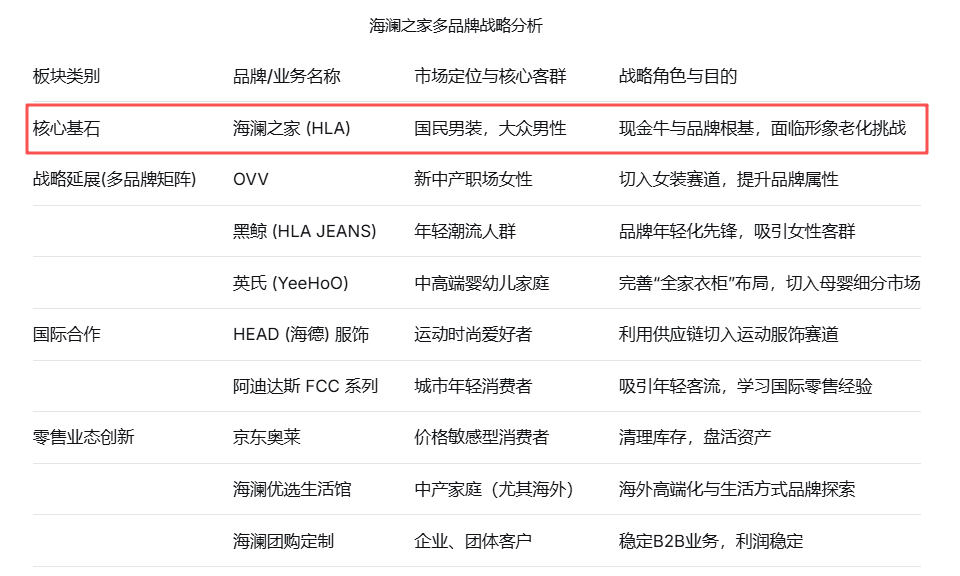 针对职场女性,推出OVV女装品牌;针对年轻潮流人群,推出黑鲸(HLA JEANS)品牌;针对孩童,推出英氏(YeeHoO)品牌。