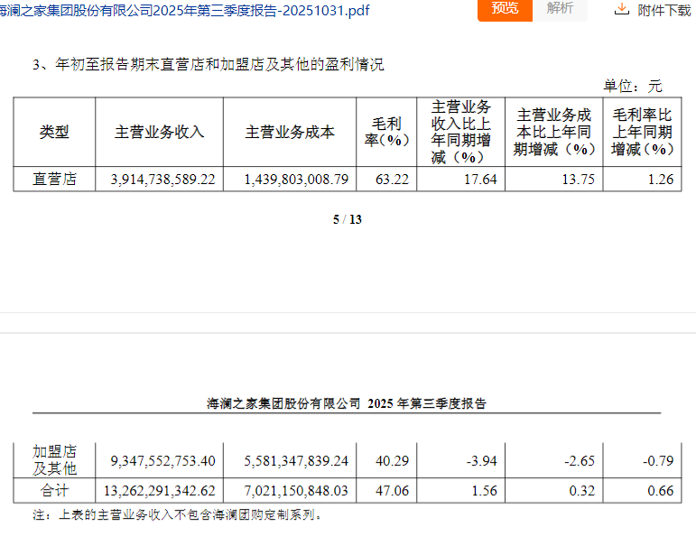 财报数据显示,直营门店在2025年前三季度毛利率高达63.22%,但加盟及其他店铺,毛利率只有40.29%,少了超20个百分点。
