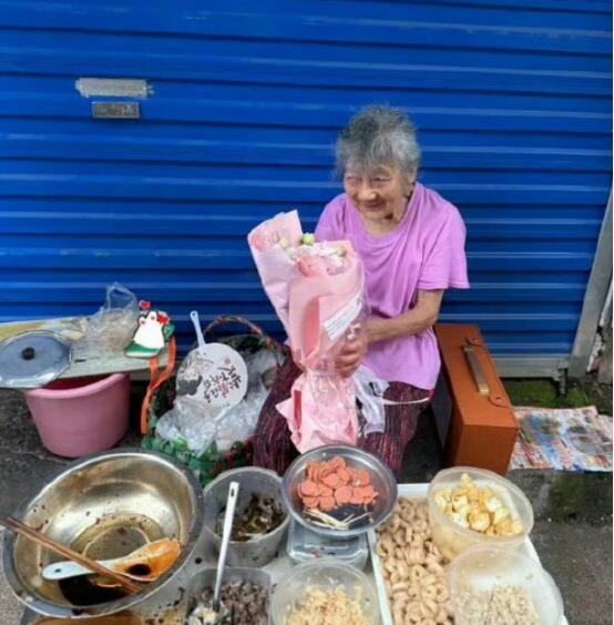 8月31日下午,南昌街头暑气未消,邓超却戴着棒球帽、穿着T恤,熟门熟路地走到百花洲街道的小摊前,蹲在地上和76岁的程奶奶聊起了天。桌上依旧是那几样——藕片、素肠、海带,一毛一串,39年没涨过价。邓超把带来的鲜花和中秋月饼递到奶奶手里,夸她“像花儿一样年轻”,奶奶笑得合不拢嘴,顺手往他袋子里多夹了几片他最爱的藕片,还心疼他“瘦了,要多吃点”。