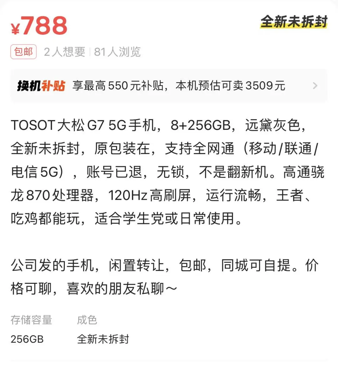 同时,格力官方账号也确认了发手机属实,即10月17日,格力子公司认证账号“格力董明珠健康家郑州直播间”发布视频称:“手机福利已发到每个员工的手中。”不过,格力客服则回应,不清楚这个活动,“这个可能是厂家还是总部那边,发这个手机,可能是一个激励活动。之前也听说过这个,有员工给我们打过电话说过这个情况,但是我们这边具体没有收到这个政策。”此外,小柴还发现,在二手平台某鱼,也有大量格力G7转让的信息,标价从三百多到七百不等,一般未拆封的在六七百元。