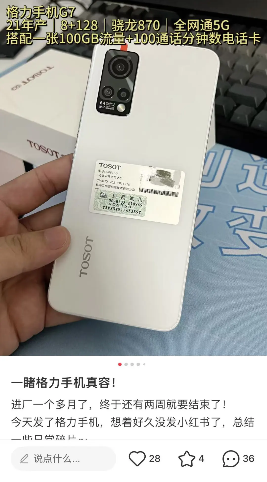 看到格力又给员工发手机,不少吃瓜群众表示,难道格力又发布新手机了?事实上并不是的,有疑似格力员工晒出这款产品的细节,这是一款2021年的产品。这款手机生产自2021年,搭载骁龙870……手机名称为格力大松G7。