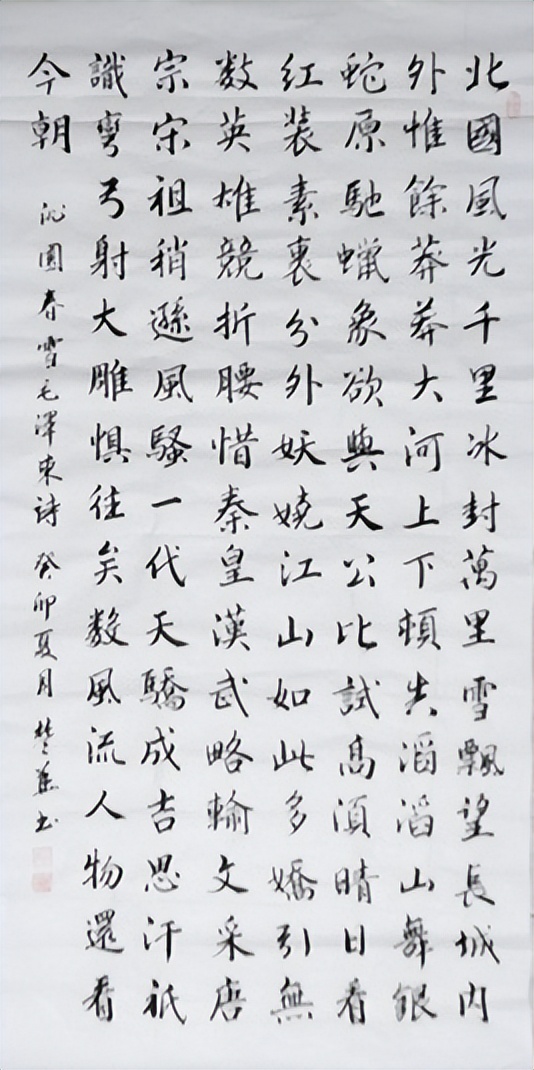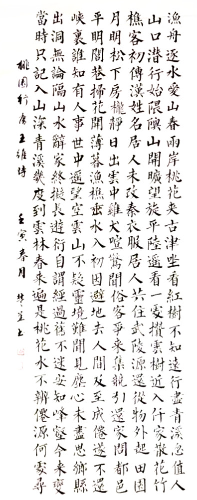 沈楚华的楷书工稳端庄是其特质,工稳因其守法,端庄因其本性,而清秀俊逸则是其气韵,清秀乃是内蕴的外化,俊逸则因其书卷气、文人气的显现。正因如此,沈楚华的楷书方格之内,似有天地之阔,观之,如秋水视底,赏心悦目,品之,如春风含馨,使人惬意,可见沈楚华取得了楷书的真功,得到了楷书的大成,也可见沈楚华的书风已达“心归澄澈之境”,因为心境影响着书品,人品决定着书艺,“如其学、如其志,如其人,是也”。放眼当代书坛,能修出真功的书法家着实不多,而从沈楚华的楷书之中却真切地看到了他大逐“书法之法”的纯粹之心,也看到了他大逐“书法之艺”的精力驻守。