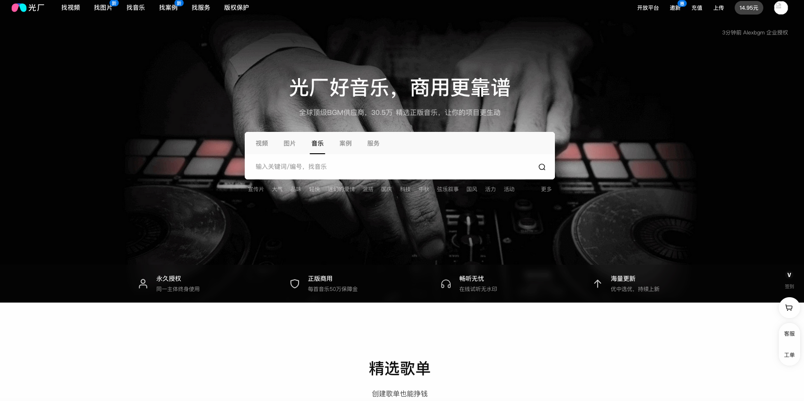 光厂成立于2018年,是国内较早聚焦“场景化纯音乐”的平台。其AI搜索系统是一大亮点,支持通过情绪、节奏、乐器等标签智能推荐,输入“国风+治愈”可精准匹配古筝与自然声效组合。平台还拥有多轨道拆分功能,下载的纯音乐可单独提取钢琴、小提琴等声部,方便后期根据画面调整音量。此外,光厂的“场景适配”算法能根据视频内容自动推荐配乐,大幅提升找歌效率。每首音乐都附带完整的版权授权书,支持商用备案,彻底避免侵权风险。