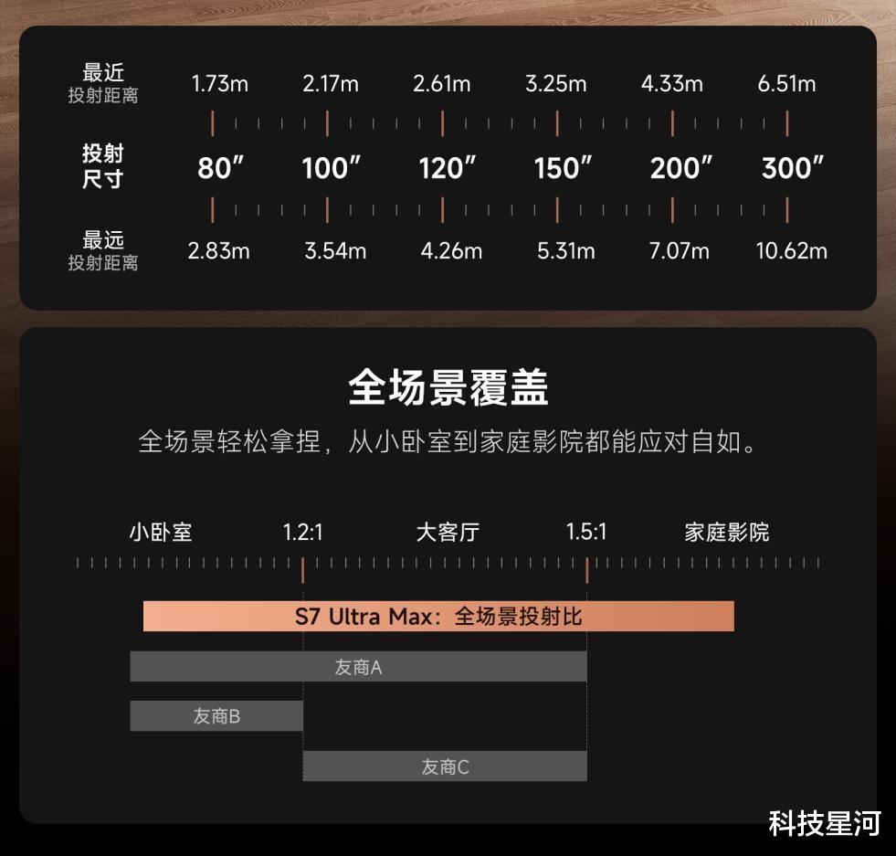 投射比范围:数值越小,投射相同尺寸画面所需距离越短。例如 0.98:1 的投射比意味着贴墙就能投出大画面,特别适合小户型。