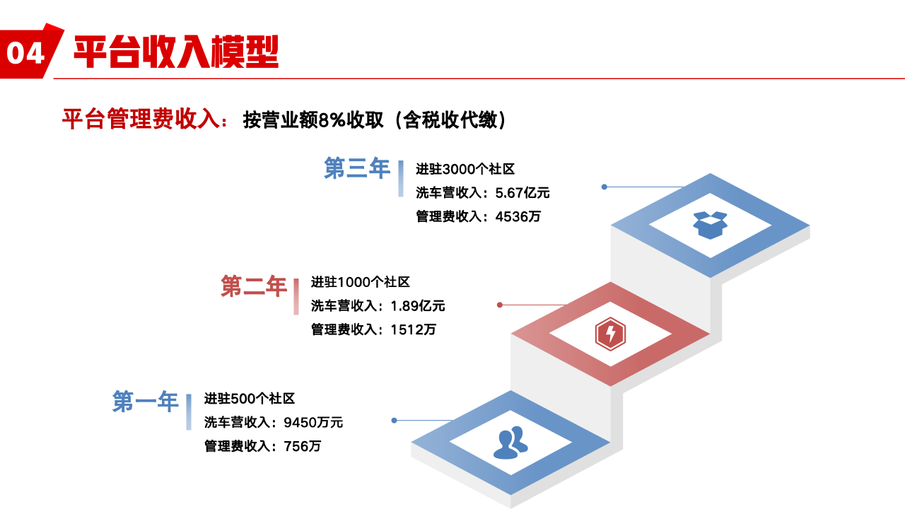 从单店盈利模型来看,一个600辆车规模的小区设一个工位,建设投入5万元,月经营成本约1500元。保守估计月均洗车450次,标洗收费35元/次,月营收约15750元,年营收达18.9万元,扣除各方分成及成本后,回本周期在12个月以内,具备良好的投资回报前景。平台方面通过收取营业额8%的管理费,逐步扩展至全国社区,预计三年内进驻3000个社区,实现规模化管理与持续收益。