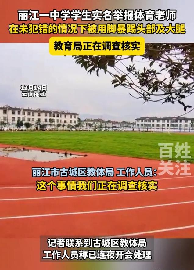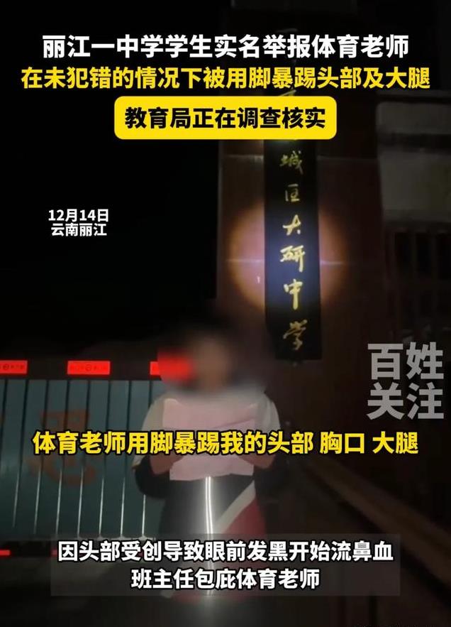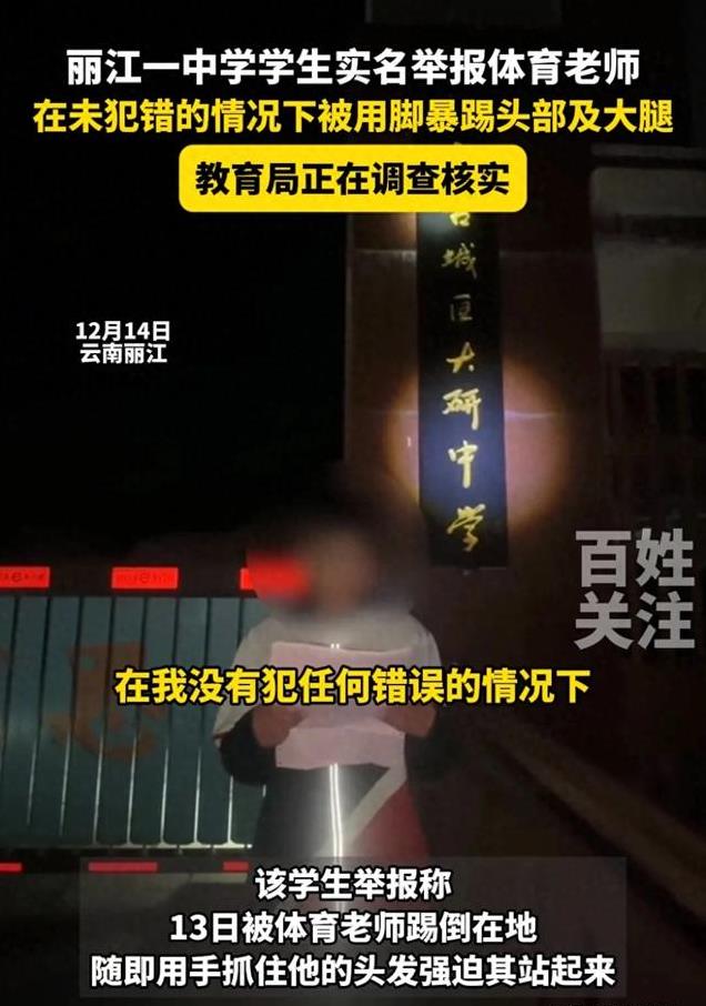 12月13日,云南丽江古城区大研中学一名学生实名举报称:上体育课的时候,在我未犯任何错误的情况下被体育老师陈某某用脚暴踢我的头部、胸口、大腿,被踢倒在地后用手抓住头发强迫站起来,因头部受创导致眼前发黑?开始流鼻血?。