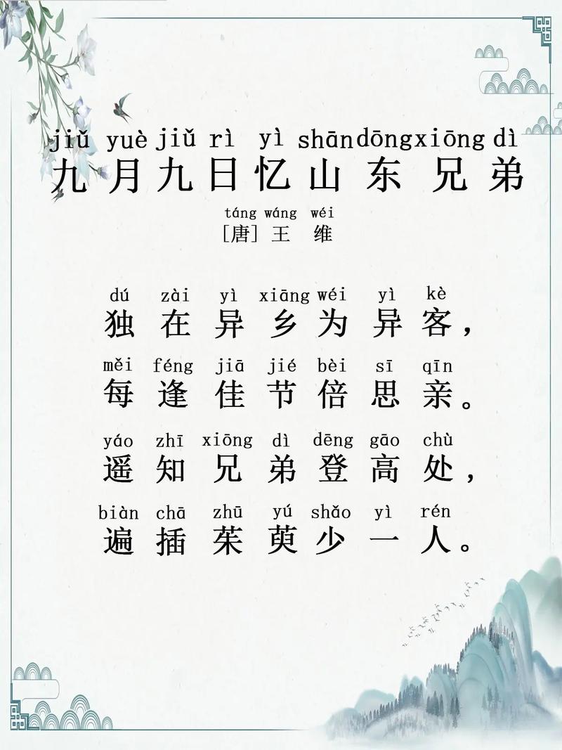 《九月九日忆山东兄弟》是唐代诗人王维的名篇之一。此诗写出了游子的思乡怀亲之情。写异乡异土生活的孤独凄然,因而时时怀乡思人,遇到佳节良辰,思念倍加。远在家乡的兄弟,按照重阳节的风俗而登高时,也在怀念自己。