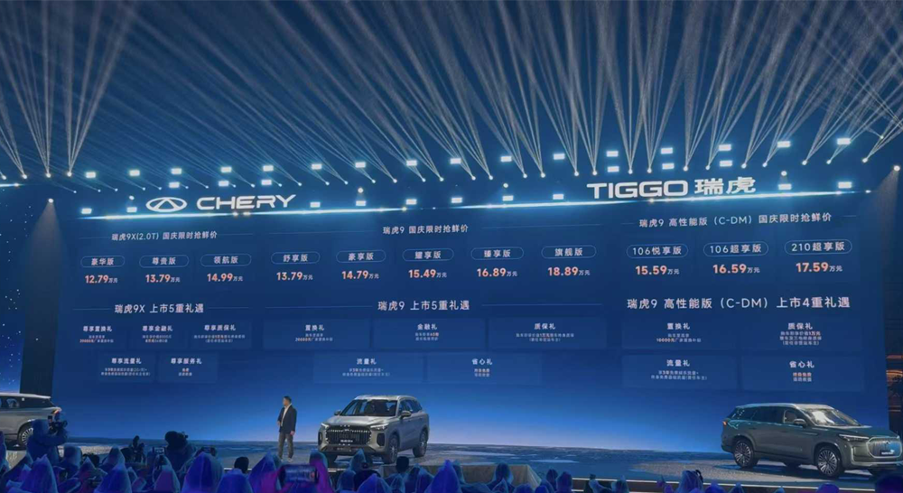 新款瑞虎9家族上市开售,其中新款瑞虎9推出5款车型,售价区间15.29-20.39万元,国庆假期抢鲜价13.79万元起;瑞虎9 C-DM推出3款车型,售价区间16.59-18.59万元,国庆假期抢鲜价15.59万元起;瑞虎9X同样推出3款车型,售价区间14.79-16.99万元,国庆假期抢鲜价12.79万元起。新款瑞虎9主要针对配置进行了细节调整,新增耀享版车型,高配车型将搭载SONY 14扬声器环绕音响、256色光瀑音律氛围灯、C-PURE奇瑞净立方绿色座舱+高档智能香氛系统等配置。