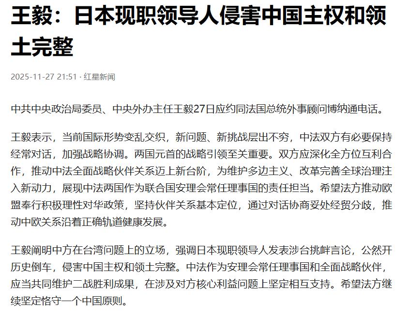 王毅外长特意选择与法国对话时发声,是在构建国际统一战线。法国是欧盟核心国家,马克龙即将访华,王毅借机拉拢欧洲,孤立日本。