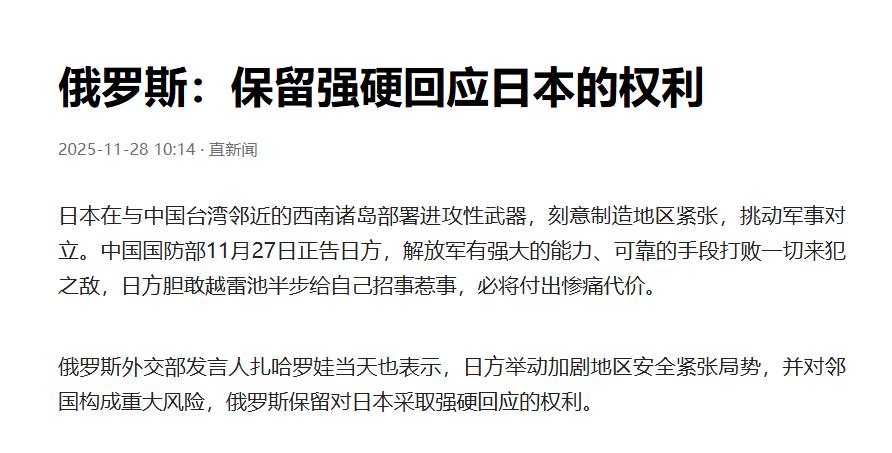 同一天,俄罗斯也站出来批评日本举动加剧地区紧张,称对日保留强硬回应的权利。