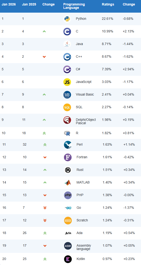 大家好,我是近屿智能。新年伊始,TIOBE编程语言排行榜如期发布。这份榜单不仅是技术趋势的晴雨表,更是每位从业者审视自身、捕捉未来机遇的“战略地图”。今天,我们就来深度解读,Python持续霸榜背后,究竟隐藏着怎样的逻辑与机会。