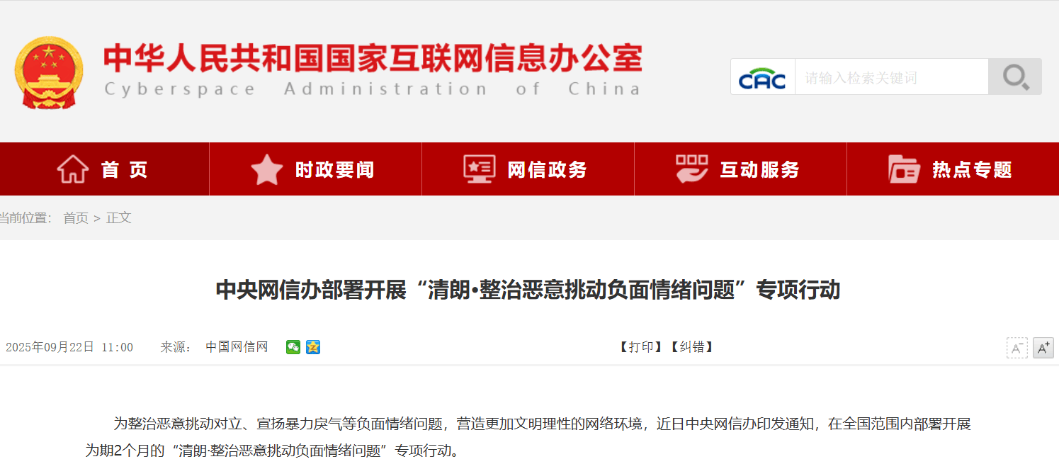 中央网信办部署专项行动整治恶意挑动负面情绪问题