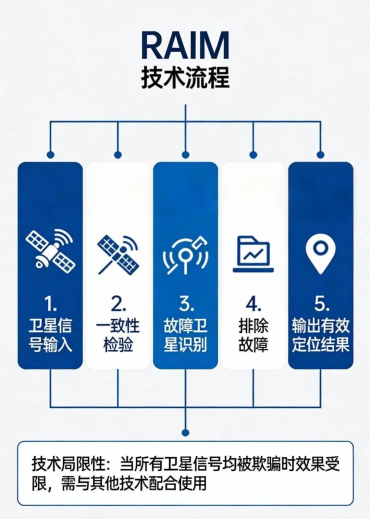 这是一种低成本的算法级抗干扰技术,其核心原理是利用多颗卫星冗余观测值进行一致性检验,当某颗卫星信号存在异常(如受到欺骗干扰或多路径效应影响)时,RAIM能通过残差分析识别故障卫星并排除其影响,确保定位结果的有效性。但该技术在所有卫星信号均被欺骗时效果受限,需与其他技术配合使用。