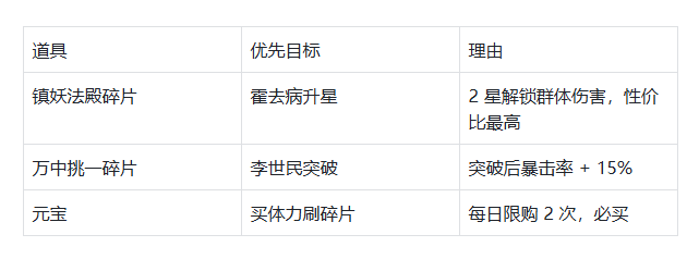 养成优先级:霍去病(升 3 星)>花木兰(吸血刀)>虞姬(护盾强化)