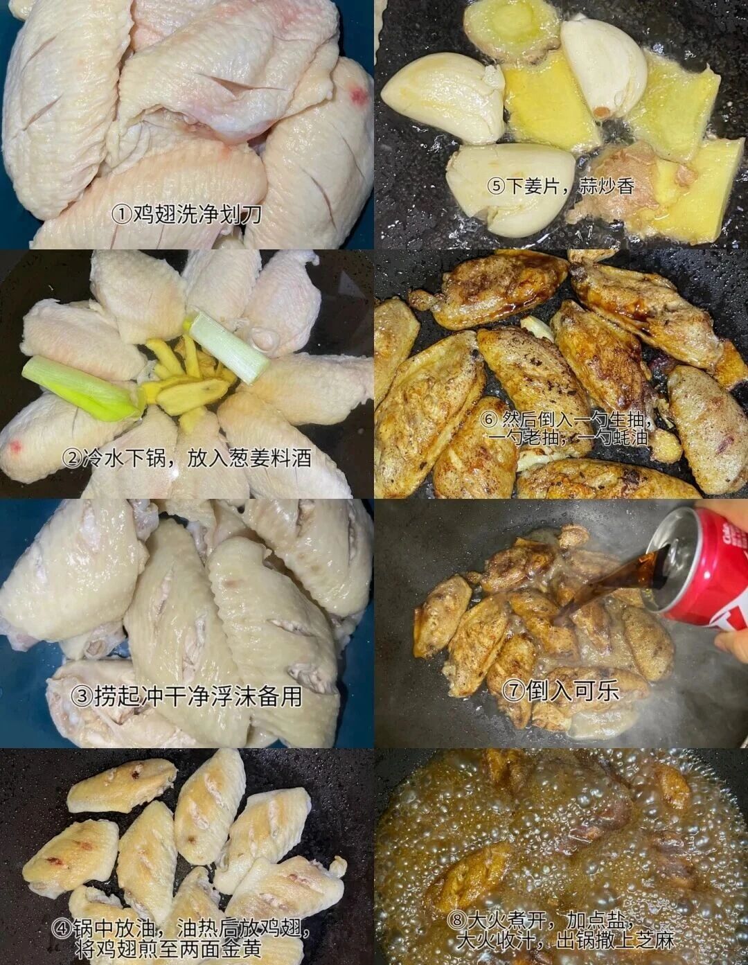 鸡翅、可乐、生姜、大蒜、白芝麻、料酒、生抽、老抽、蚝油、盐、食用油
