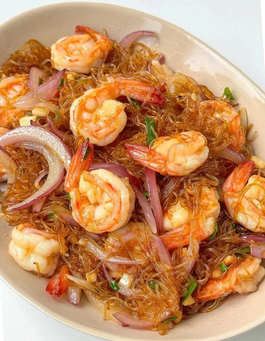 4. 虾油爆香蒜末,下粉丝炒软,加虾仁、洋葱丝,淋料汁翻匀,撒葱花即可。