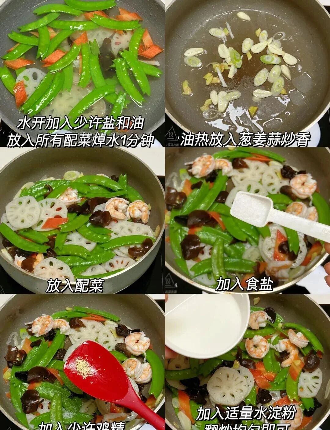 荷兰豆、莲藕、胡萝卜、鲜虾、木耳、葱、姜、蒜、盐、鸡精、水淀粉、食用油