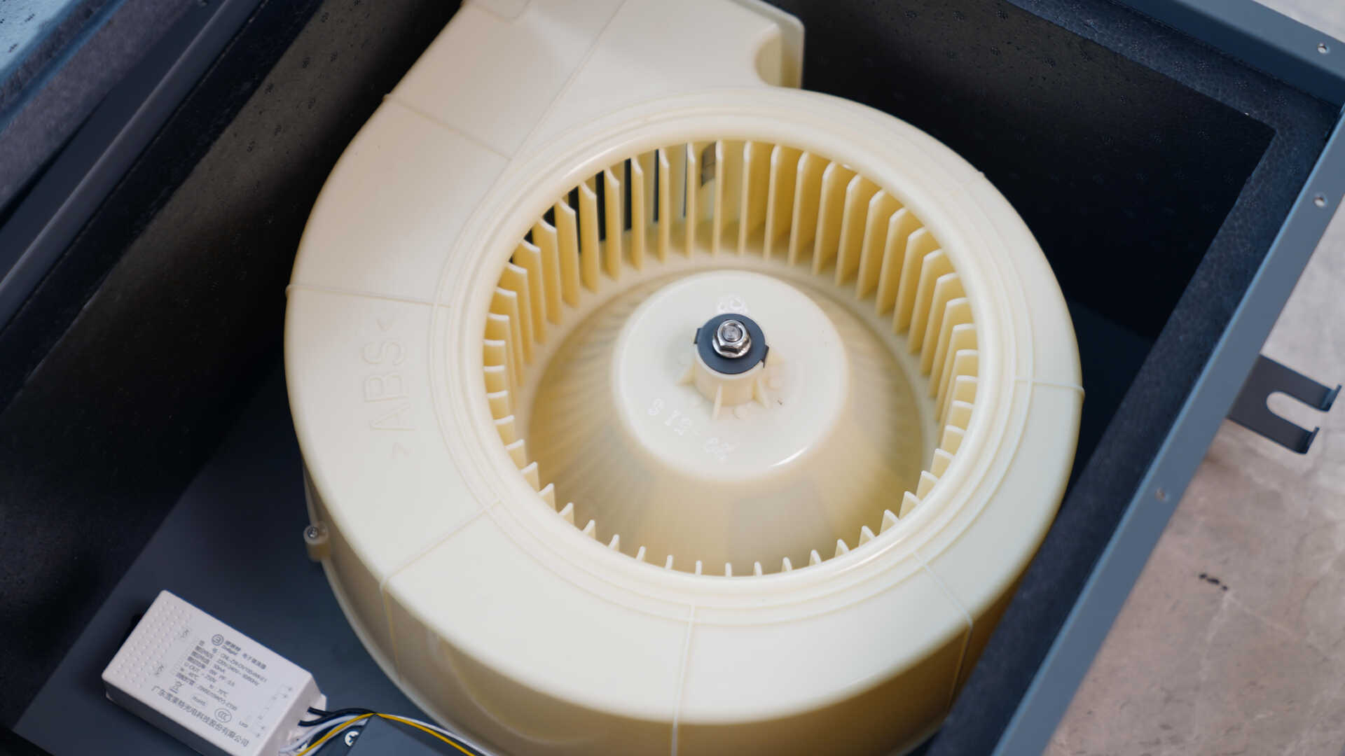 当我看到叶轮的设计,再一次给土豆点个赞,为了将内胆空间最大化,让出更多空间给风机和叶轮,土豆直接摒弃掉了最常规设计,风机居然被叶轮罩遮盖,而叶轮罩也是直接固定于内腔底部,在直接让出了1~2cm空间的前提下,还减少了风机结构本身带来的扰流,增加风量,降低噪音表现,这对于吊顶新风机设计带来的结构优势真的是不言而喻,难怪土豆吊顶机要在EPP之上再放一层金属板,作为固定风机,叶轮和叶轮罩。
