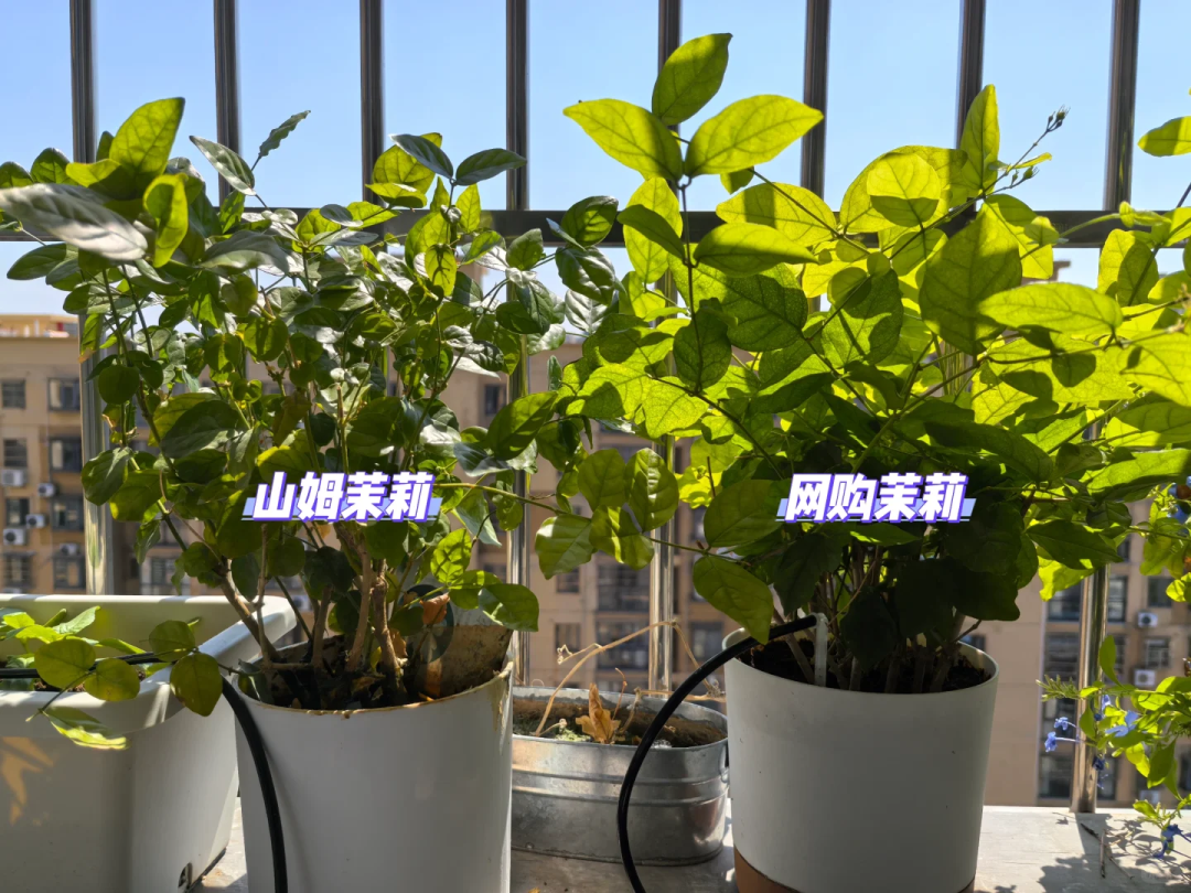 只见图片中的两盆茉莉,一个来自拼夕夕,花了9.9,另一个来自山姆,花费19.9,但拼夕夕买的茉莉状态却好很多。