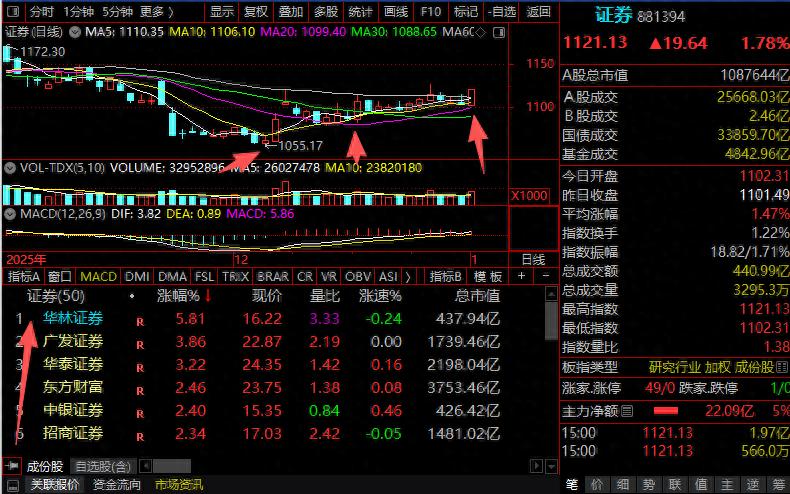 喜迎2026开门红,大盘放量上行,在券商和保险等助力下,时隔34个交易日,重回4000点上方,且一幅逼空的模样,重新站上4000点大关,录得12连阳。截止收盘,沪指涨1.38%,收报4023.42点;深证成指涨2.24%,收报13828.63点;创业板指涨2.85%,收报3294.55点。全市成交25675亿,较上一交易日20659亿大幅放量超5000亿。